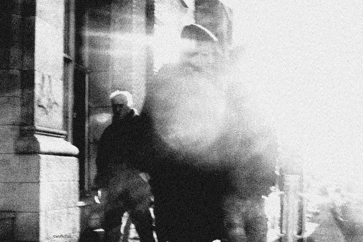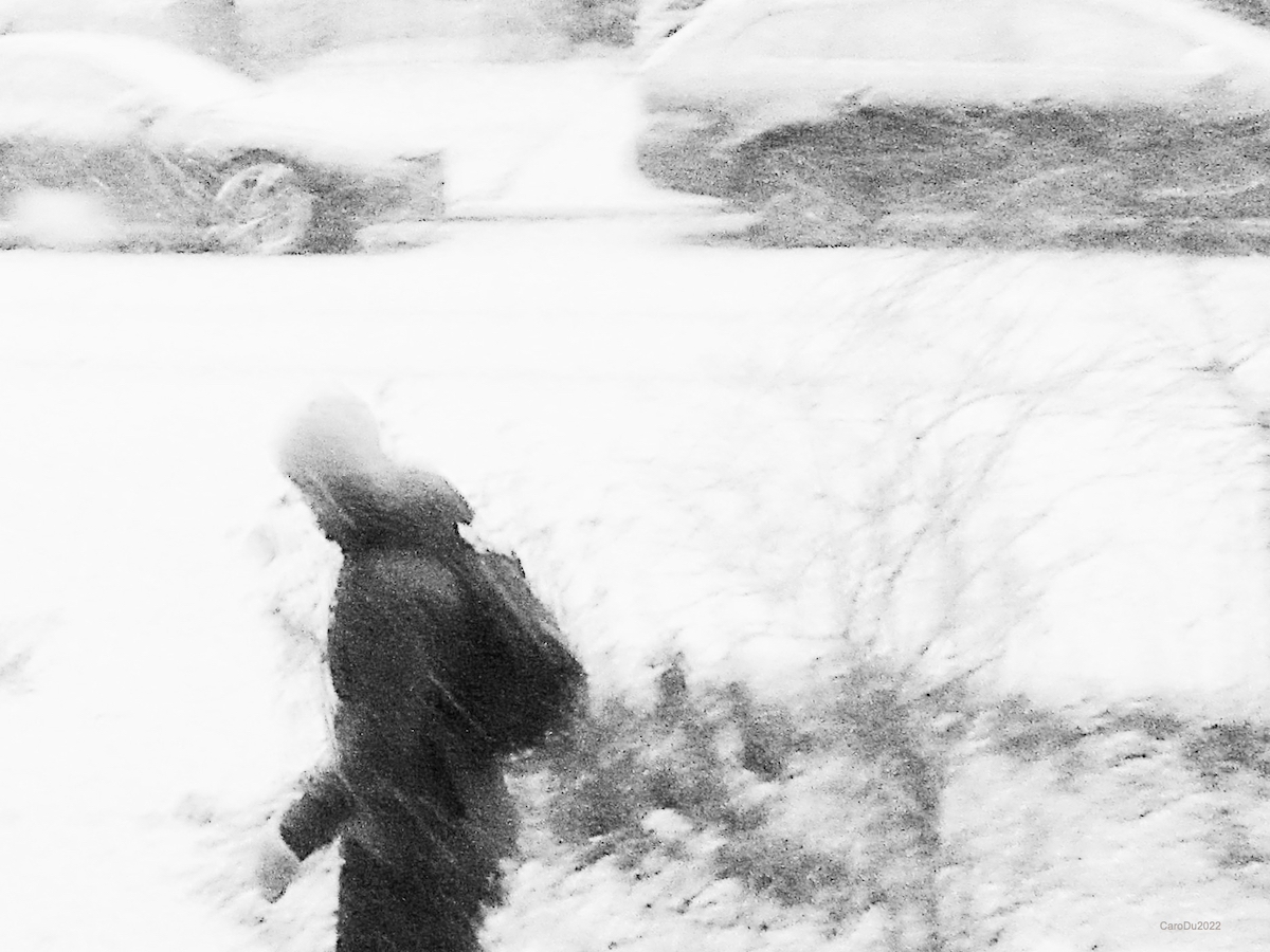 On dirait un théâtre. D’autres diraient que c’est une rue, où la neige a blanchi les jours avant que le vent ne l’embrouille. Une chose en amène une autre. Comme ces deux femmes sur le trottoir, qui se sont arrêtées pour rire. Et le chat noir, comme une tache d’encre.